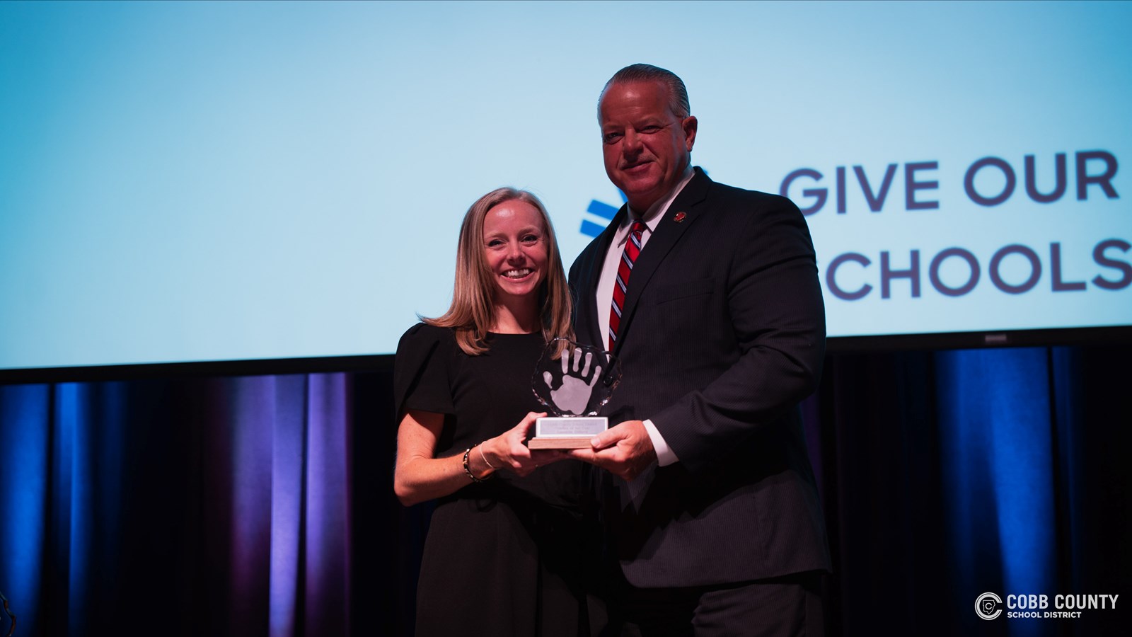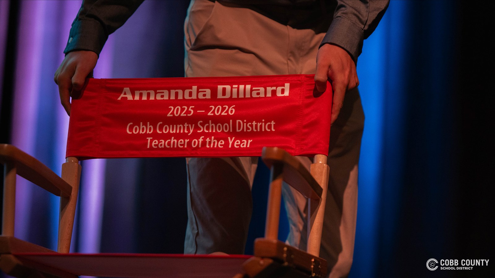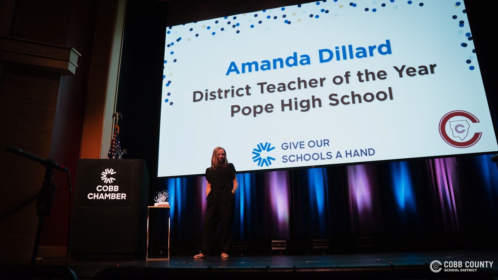 Before the handprint unveiling, a special ceremony was held at the Earl and Smith Strand Theatre. The Pope Chorus performed on stage before Superintendent Chris Ragsdale introduced Dillard as the 2025-2026 Cobb County Teacher of the Year.