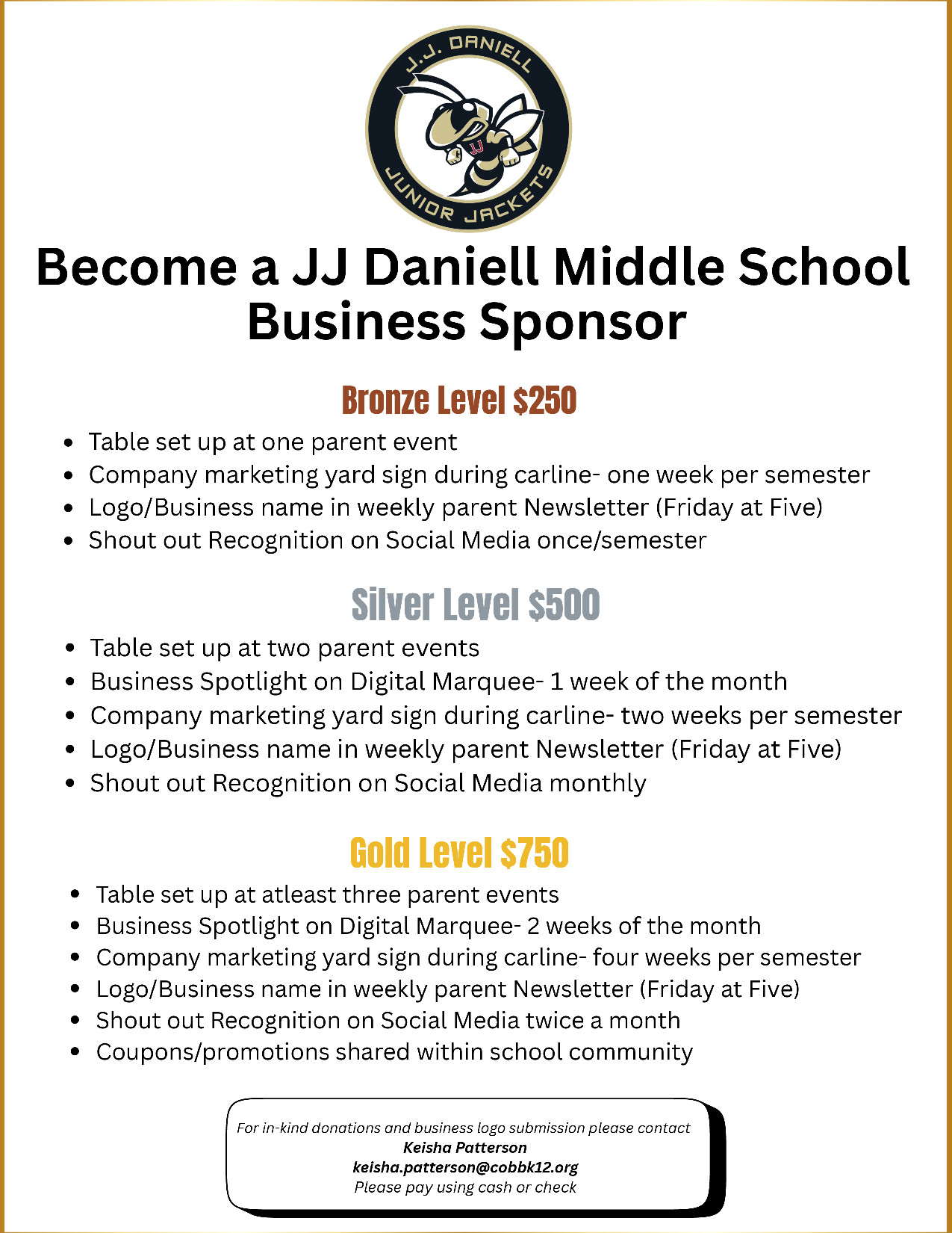 Please contact lauren.mcafee@cobbk12.org or keisha.patterson@cobbk12.org for information on how your business can be a J.J. Daniell Middle School Sponsor.