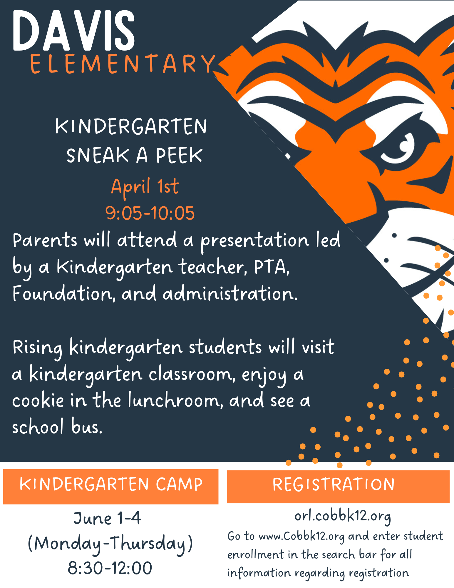 Rising kindergarten students will visit a classroom, enjoy a cookie in the lunchroom, and see a school bus.