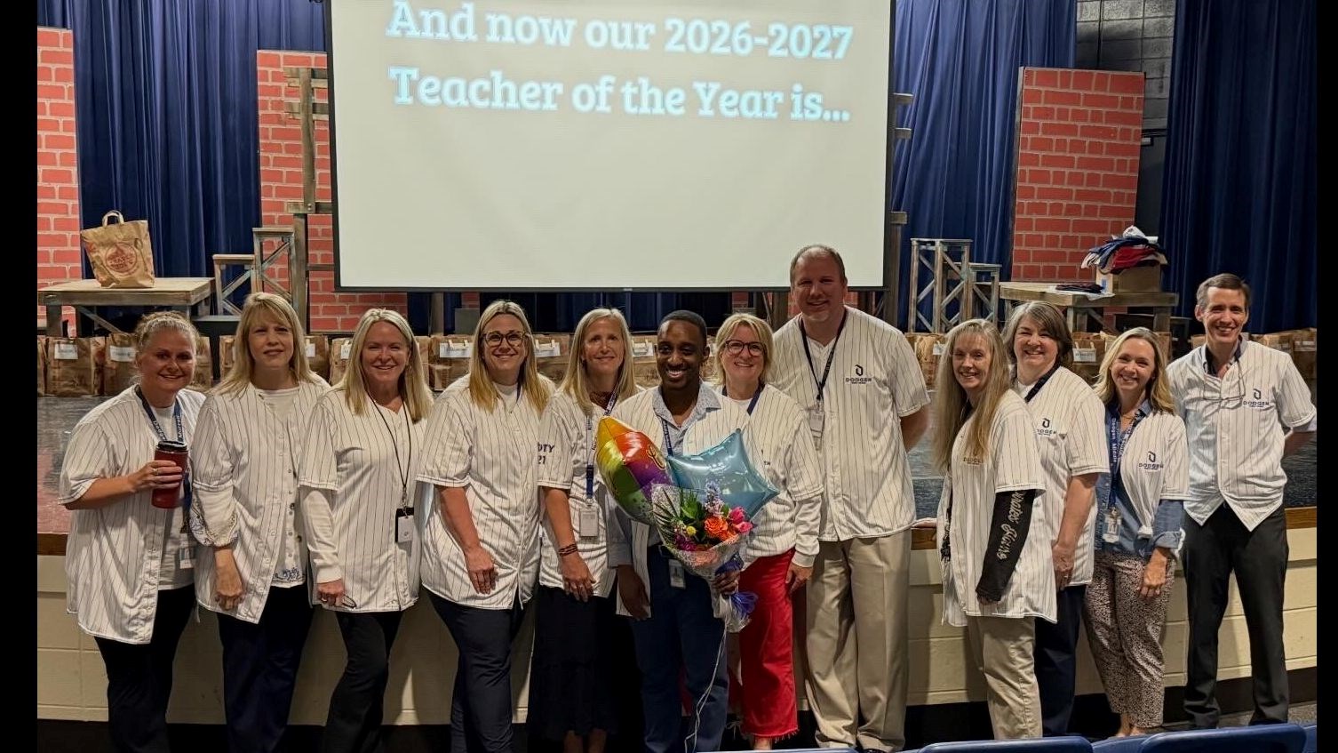 After the big announcement of our Classified Employee of the Year, Dodgen's former Teachers of the Year did the honors to welcome our newest Teacher of the Year to the club in a "The Office" themed announcement celebrating the 50 years of Dodgen and highlighting the changes that education has seen in that time with humor and heart. Several special guests were also in attendance at the celebration event including the friends, family, and colleagues of our honorees.