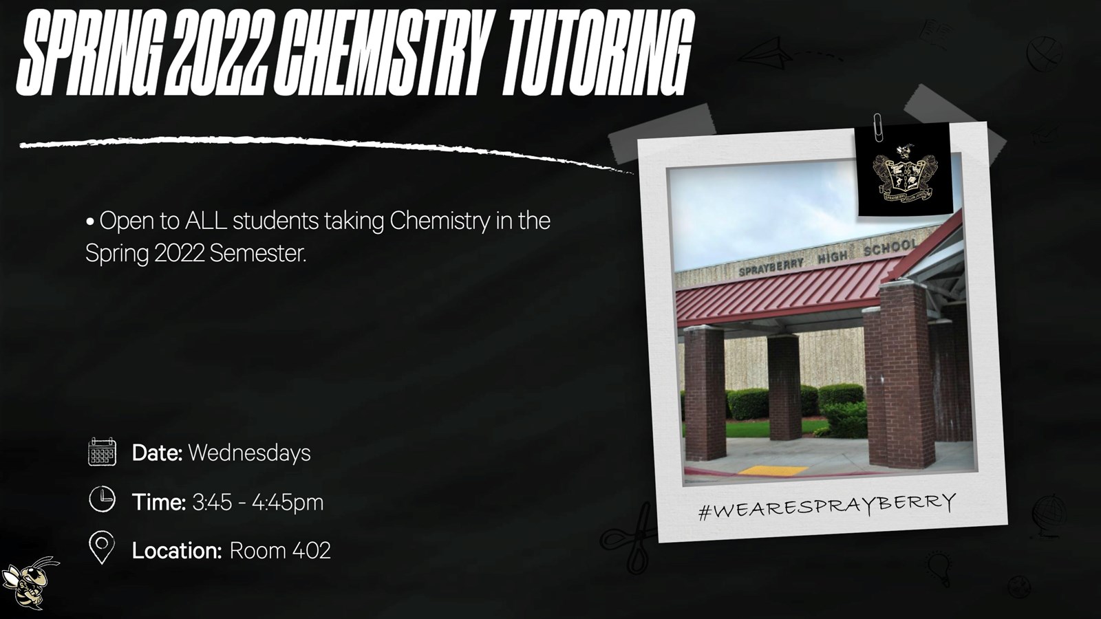 | Chemistry | Wednesday | Room 402 | 3:45pm |